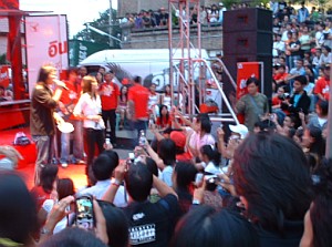 セントラル・ガドスワンゲーオ前の特設会場にてパラポン。 高を括って夕方6時半過ぎに行ったら、もうパラポンが歌ってました。 人はたくさーん居るのですが、チェンマイのお客さん、温度低め。ボクでも知ってるヒット曲歌ってるのに。うーん、キーアーイ(shy)? バックは昨年末にBKK・プラトゥナームセンターで見たメンツと同じ。 全て生演奏。この人たち、演奏はキッチリなんですけど愛想ないのよね、バンマスとおぼしきキーボードが唯一雰囲気づくりで盛り上げてます。 と、おもむろに観客が動き出し、舞台前にかぶりつきに...何? そう彼女が出てきたのです。 今年デビュー組の中では一番注目(されていると想われる)