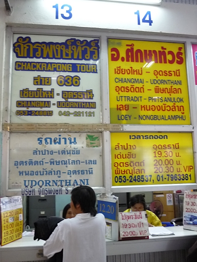 ラオスを目指す人はチェンマイからのバスはウドンの郊外の第2バスターミナル(新バスターミナル)に到着するので、そこから第1バスターミナル(旧バスターミナル)にトゥクトゥクで移動して下さい。15分ほどでしょうか。8時発ビエンチャン行きに間に合えば一番スムーズですがボクは間に合いませんでした…(このお話は別頁で)。